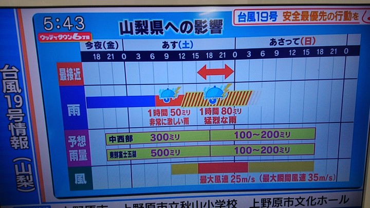 暴風域が非常に広く過去最大級の台風19号が東海・関東に迫ってきています。テレビでは月曜日位からこの台風を警戒するように報道していました。写真の情報は午後5時40分の情報です。山中湖では予想雨量が600〜800mm、明日正午から翌朝まで1時間に最大80mmの豪雨予想。最大瞬間風速は60m/sとなっています。早め早めの行動を!今日の山中湖は曇り、昼前から本降りの雨。最高20℃、最低13℃19/10/11