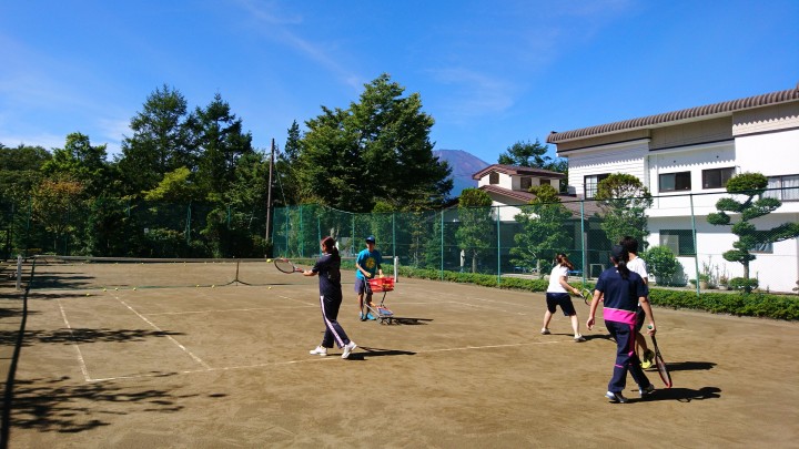 今日はくっきり晴れた山中湖です。宿泊中のローランギャロ様は、青空の下、富士山を見ながらテニス練習に励んでいました。各コートに分かれて、球出し練習など上級生が丁寧に教えてました。合宿後の上達具合が楽しみですね。最高気温は28℃、最低15℃。寒暖の差が激しいですので、体調管理には気を付けてください。