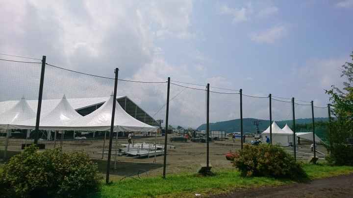今日、ラブシャ会場である山中湖「きらら」を通ったので、外からちょっと見てきました。関係者の人たちが会場作りに励んでいましたが、その規模の大きさに驚きました。これから更に人が増えていくんでしょうね。今日の山中湖は曇り時々晴れ、お昼に一時的に強い雨が降りました。最高気温は24℃、最低16℃。日中もだいぶ涼しくなりました。