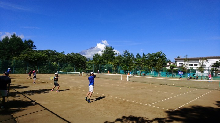 今日の最高気温は30℃、これで10日連続の真夏日となった山中湖です。暑いですが宿泊中のインパクト様はチーム戦を開催して、各コートに分かれて気合いの入った試合をしています。どのコートも熱戦でした。今朝の最低18℃、朝晩は涼しいです。
