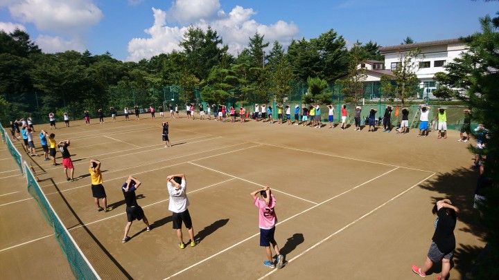 今日の山中湖は晴れ、最高気温は真夏日の31℃、最低18℃。昨日から宿泊中のインパクト様は、強い日差しの中、各コートに分かれて元気に練習をしていました。写真は練習前の体操です。この後、気合いの入った練習が始まりました。ガンバって下さい。