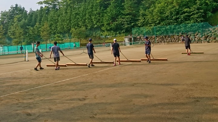 7月30日からお泊まりの高校生の皆さま、3泊夏合宿お疲れ様でした。先生やコーチの指導の下、たくさんボールを打ち込んでいました。試合、頑張って下さいね。スタッフ一同、来年もお待ちしています。今日はゆっくり休んで下さい。写真は、練習終わりのブラシ掛け状況です。慣れているのでとても上手でした。今日からお越しの高校生の皆さん、よろしくお願いします。今日の山中湖は晴れ、最高気温31℃、日差しが強烈でした。