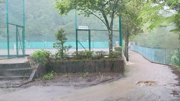 雨は12時にかなり弱まって、午後3時には止みました。昨夜10時から今日午後3時の17時間で庭バケツ計測ながらまさかの350mm降りました。恐ろしい雨量でした。大きな災害が無くてよかったです。ちなみに計測地点が違いますが、気象庁発表の山中湖総雨量は170mmでした。写真は9時30分のコート脇、まるで滝でした。