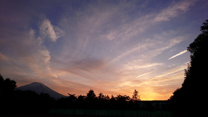 今日も全国的に季節外れの暑さとなり、ここ山中湖の最高気温は29.3℃、5月の観測では歴代4位、ちなみに昨日は29.6℃で歴代3位でした。写真は昨日の夕焼けです。とても綺麗だったので、今日アップしました。今日の夕方は雲が出て焼けませんでしたが、天気は少しずつ崩れていき明日は午後位から雨らしいです。テニスコートがカラカラですので恵みの雨になるといいですね。