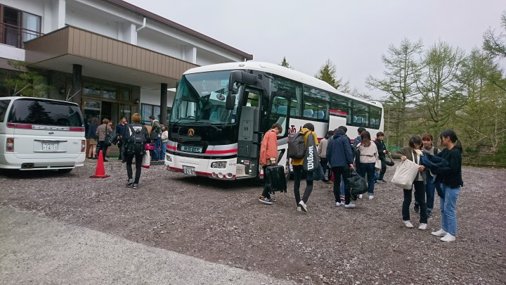 マロンの皆様、春合宿に当館をご利用していただき、ありがとうございました。上級生が1年生に丁寧にテニスを教えていて、みんな楽しそうにテニスをしていました。スタッフ一同、またのお越しをお待ちしています。気を付けてお帰り下さい。今日の山中湖は曇り、夕方4時から雨が降り出しました。19/04/29