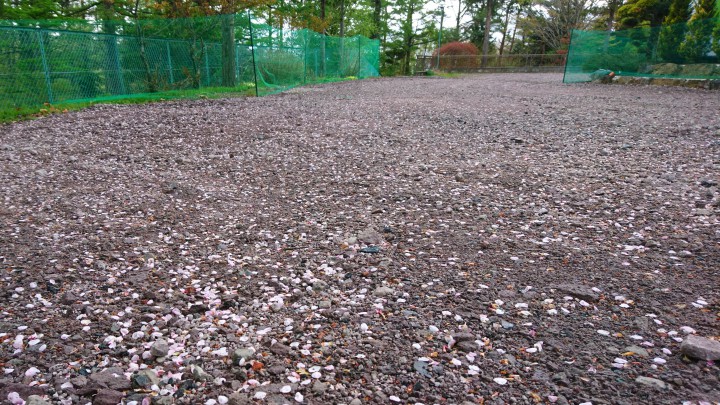 桜が大分散ってきました。先日の150mmの大雨でも散りはしませんでしたが、いよいよ満開は終わったようです。写真は裏庭ですが、桜色の砕石の上に散った桜の花びらの組み合わせが、遠くから見るとピンクのじゅうたんみたいでした。今日の山中湖は曇り時々小雨、今朝の最低5℃最高15℃、肌寒い1日でした。19/05/06
