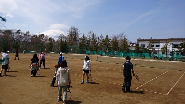 今日の山中湖は晴れ、今朝の最低は6℃、暖かい朝を迎えました。日中の最高気温も17℃、少し風が強かったのですが、テニスをするには暑すぎず寒すぎずのいいコンディションの1日でした。今日からお越しのルフテニスクラブ様、今年もよろしくお願いします。富士山と桜を見ながら、みんなで楽しくテニスをして頂きたいと思います。