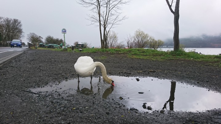 今朝から小雨が降っていた山中湖、午前中も小雨が降っていて午後になってやっと晴れ間が見えました。雨は晴れていても時たまぱらついていて、『山の天気』な1日でした。予報によると明日未明から雨が降るらしいです。あまり降ってほしくないですね。写真は山中湖南側の国道138号線わきの水たまりです。白鳥が水を飲んでいました。その脇には山中湖があるのですが、味が違うんでしょうか。19/04/26
