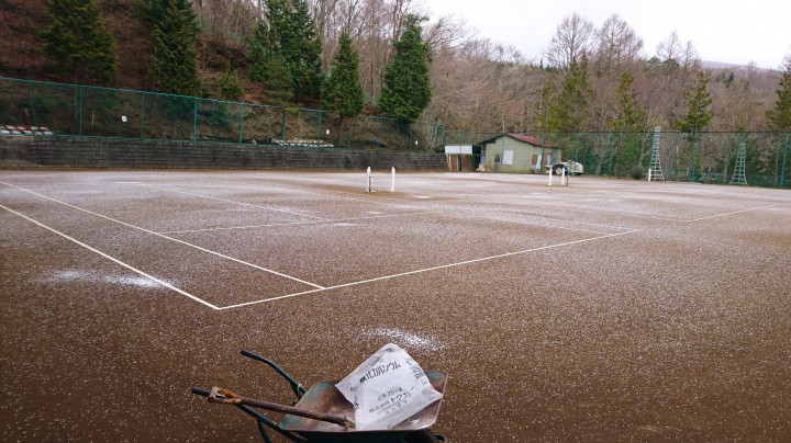 今日はテニスコートに塩カルを撒きました。本格的に撒くのは夏が始まる前ですが、当館ではこの時期にも小量ですが撒いています。昨日の朝は−4℃で霜が降りましたが、今朝は−0℃で霜は無し、よかったです。今日の山中湖は曇り、最高気温は13℃でした。19/04/17