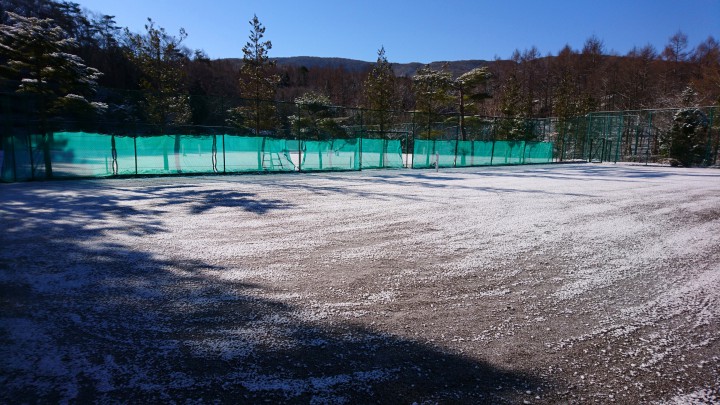 昨日の雪は積雪2cm、大したことなくて良かったのですが、朝コートを見てみたら写真の通り雪と霜で凍り付いていました。今朝の最低気温は-4℃、冷え込みました。日中はよく晴れて最高気温8℃、コートは日差しであっという間に解けましたが、先日の雨からまだ3日目なので今日も養生したいと思います。