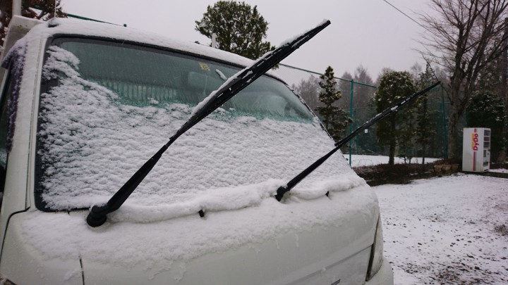 昨日よりも最高気温が12℃以上気温が低くなった山中湖、朝から雨や雪がぱらついていましたが、午後になると雪になり暗くなってから大雪みたいになりました。雪は午後8時頃止んで、当館庭で積雪5?でした。夜の道路には雪が残っていますので、車の運転には注意して下さい。最高気温は2月下旬並みの5℃、今朝の最低は2℃、夜9時現在−2℃冷えてきています。写真は午後2時、雪で白くなった車です。