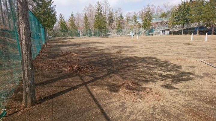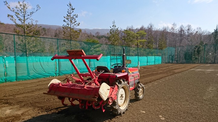 今日の山中湖は4月中旬並みの陽気となりました。今朝の最低気温は1℃、午前は曇りでしたが午後はよく晴れて最高気温は14℃。午後から一気にポカポカ陽気となったので、午後2時半から急遽トラクターによる掘り起こしを行うことにしました。新品に変えたロータリーの刃のおかげでいい仕上がりです。いよいよコート作りが始まりました。気合いが入ります。