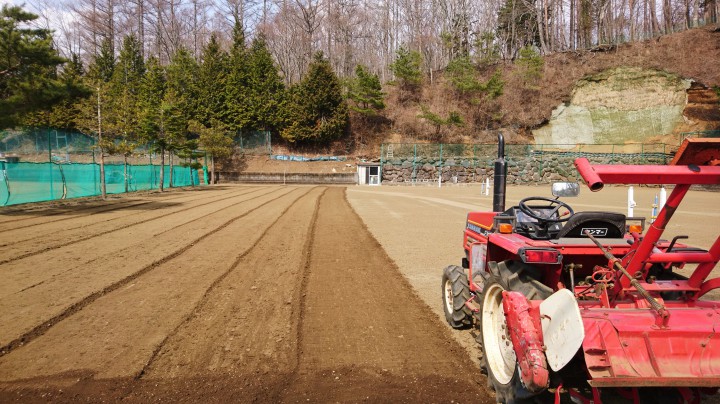 今日の山中湖は4月中旬並みの陽気となりました。今朝の最低気温は1℃、午前は曇りでしたが午後はよく晴れて最高気温は14℃。午後から一気にポカポカ陽気となったので、午後2時半から急遽トラクターによる掘り起こしを行うことにしました。新品に変えたロータリーの刃のおかげでいい仕上がりです。いよいよコート作りが始まりました。気合いが入ります。19/03/26