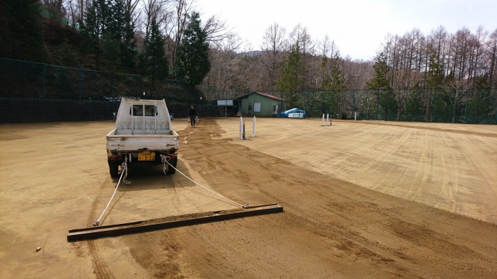 昨日に続いて今日もトラクターでテニスコートを掘り起こしました。掘り起こし深さは約10cm、この作業によりコート表面がきめ細かくなって、きれいな仕上がりになります。作業完了後は、軽いローラー&重いローラーで転圧をして今日の作業は終わりです。明日は平たん作業の予定です。今日の山中湖は晴れ、今朝の最低は1℃、最高は15℃。19/03/27