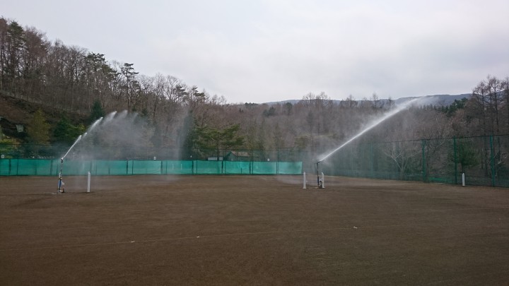 今日は昨日トラクターで掘り起こしたテニスコートに、大型スプリンクラーで水撒きを行いました。1箇所3時間ほどの作業です。雨が降れば一番いいのですが、1日でも早くコートを固めたいので、毎年行っています。予報では明日の夜が雨らしいですね。今日の山中湖は曇り午後からは晴れ、今朝の最低気温は―1℃、最高9℃。