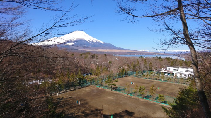 今朝も冷え込んだ山中湖、最低気温は-7.8℃、今日も霜が降りました。日中の最高は10℃でしたが、天気が良くて日差しがポカポカでした。写真は当館テニスコートの上にある展望台です。快晴だったので、富士山や山中湖、遠くの南アルプスまでくっきり見えました。日陰を除いて、雪は全くありません。