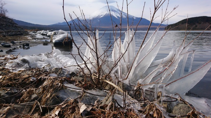 2日前に紹介した氷の造形の先には、凍った岩が並んでいます。山中湖の波打ち際に並んでいる岩は、ご覧のように凍っています。湖は凍っていないので面白い景色になっています。今日の山中湖は晴れ、今朝の最低気温は-10℃、日中の最高は6℃でした。