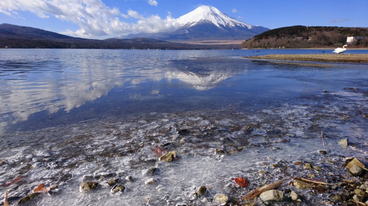 山中湖の浜は少し凍っています。