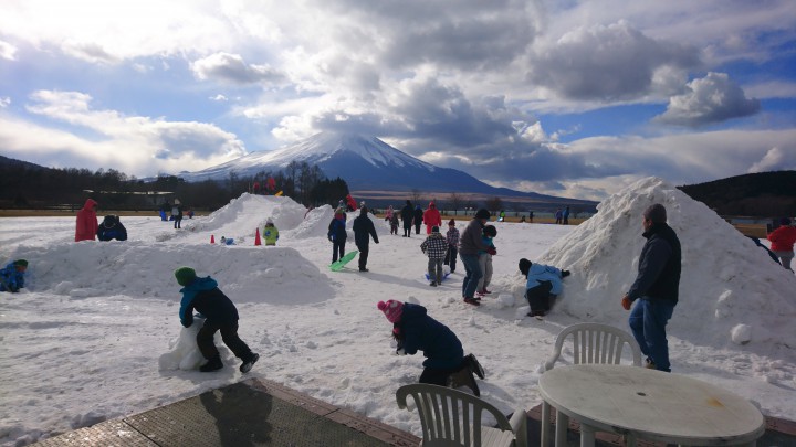 本日、山中湖「きらら」で待望の雪まつりが始まりました。雪が降らなくて心配されていましたが、問題なく雪で楽しめるようです。雪区画の隣にはウッドデッキを使用したテントもあり、暖をとりながら雪遊びをする子供たちを見ることが出来ます。写真は午後2時40分、この時ラッキーにも、つきたてのおもちを無料でいただきました。ほかほかでとても美味しかったです。