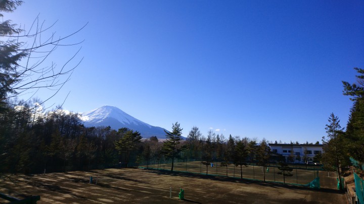 今日も強烈寒波の影響で、今朝の最低気温は−11.8℃、寒さで朝太陽が出ても昼になるまで霜は解けませんでした。日中は快晴でしたが最高は2℃、日向にいても寒い気温です。写真は午後2時30分、テニスコートからの富士山です。あと1時間10分で日没になるとは思えないほど空が真っ青でした。