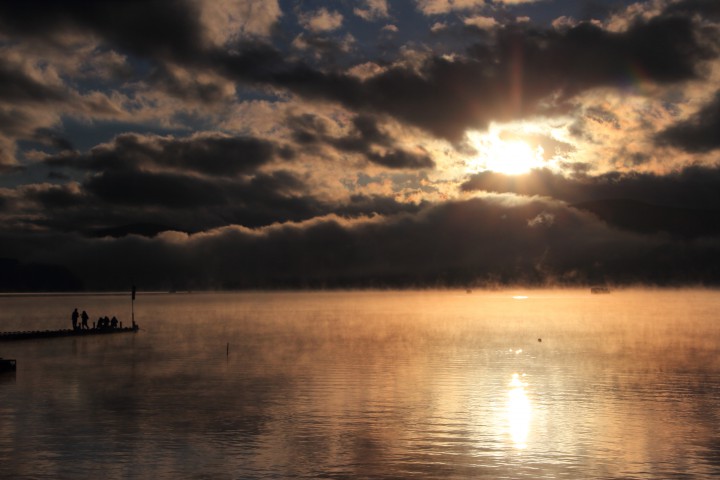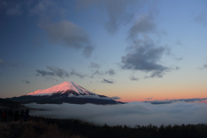 今日の山中湖は快晴、今朝の最低-11℃最高5℃。写真は7時、山中湖畔には濃い霧で富士山が全く見えなかったため、急遽パノラマ台に行って富士山を撮りました。雲海の下が山中湖です。きれいでした。