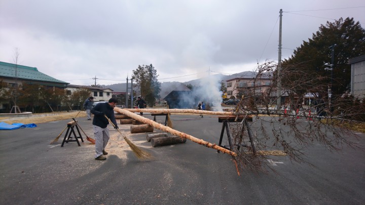 御神木は、1月14日に正月の松飾や古いお札等を道祖神の前で燃やすどんどん焼きの行事の際に建てる大木です。この神木はカラマツの大木を使い、色紙やザル、手ぬぐい、吹き流し等をつけます。この平野地区では、地区に一つの道祖神があり、この前で御神木が立てられます。長さ26m、製作中です。今日は曇りの山中湖、日中は少し雪が舞ったりもしました。日中は日差しもなく気温も2℃までしか上がらず、寒い寒い1日でした。最低−8℃。19/01/06