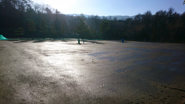 今日の山中湖の最高気温は11℃、11月下旬並みの気温でした。日中は日差しもあって少し動けば汗ばむ時間帯もありました。週末までは高めの気温らしいです。今朝の最低は−5℃、毎朝霜で辺りは真っ白です。写真は朝は9時30分のテニスコートです。霜が解けて、ぐちゃぐちゃ状態です。山中湖のテニスコートは冬、このような状態になって使用不可となってしまいます。春までテニスコートはお休みです。18/12/20