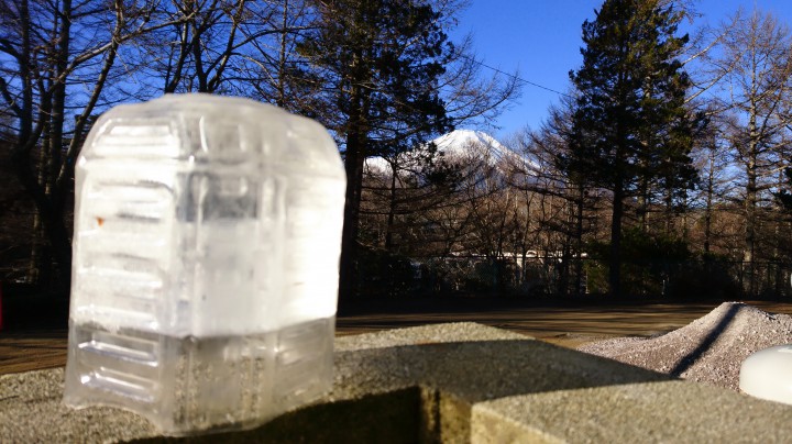 今朝の最低−11.6℃の山中湖、カップの水はカチンコチンです。