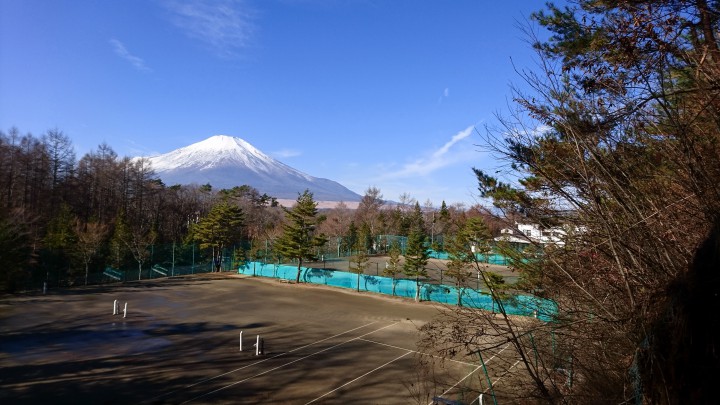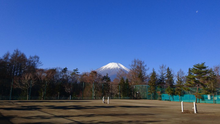 今日の山梨県内は放射冷却で冷え込み、山中湖以外の観測地点では今季最低を記録しました。山中湖の最低気温は県内最低の−2℃、テニスコートにも霜が降りて、午前中は日差しで解けてビタビタ状態でした。日中は青空で13℃まで上がり、午後3時までは暖かかったです。写真は10時、当館展望台から富士山を撮りました。コートが霜が解けて濡れています。18/11/21