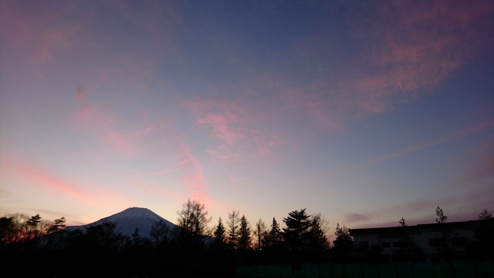 今日もいい天気の山中湖、最高気温は10℃でしたが日差しがポカポカで暖かい1日でした。今日の富士山は日中もよく見え、日没後は写真のように空がピンク色になり圧倒的な空となりました。今朝は霜が降り−2℃で下がりました。