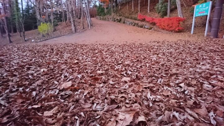 共立テニスロッヂは森林に囲まれていますので、この時期は周りが紅葉でとても綺麗です。でも、落ち葉がすごく、掃いても掃いてもまた溜まります。写真は当館入り口の坂ですが、先日ホウキではいたばかりなのに、ご覧の通り、落ち葉のじゅうたんが出来ていました。この時期の落ち葉は趣きがあっていいとは思うのですが、掃除も必要ですし。また掃きます。
