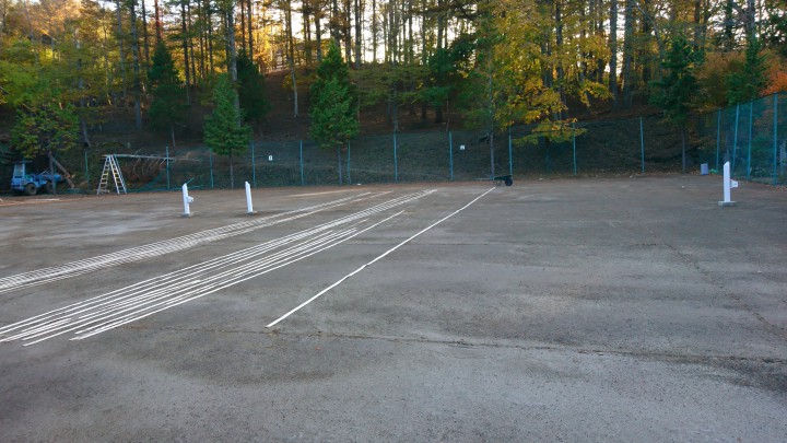 テニスシーズンもまもなく終わりに近づき、いよいよ冬支度の開始です。今日は?8〜10コートのラインテープを取りました。高所の山中湖では冬になると霜によってラインテープが浮き上がってしまうため、予め取り除いておき雪が溶けた春先に再び取り付けます。