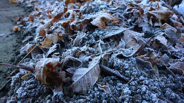山中湖は氷点下2℃、落ち葉も霜で氷漬けです