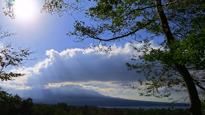 今日の山中湖は朝から快晴で気持ちのいい朝を迎えました。最高気温は19.7℃、昨日が30℃近かったので、寒く感じましたが平年並みの気温でした。写真は午後3時、当館共立テニスロッヂ展望台からの富士山です。午後からは雲が出てきて、残念ながら富士山は隠れてしまいましたが、雲間から差し込む光が光線のように見える現象の薄明光線「天使のはしご」が見れて、幻想的な時間を過ごせました。
