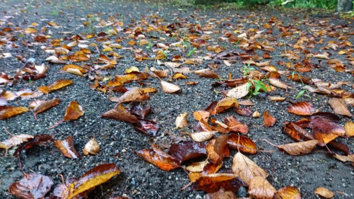 今日の山中湖は曇り時々雨、最高気温は17℃、今朝の最低は12℃でした。夕方からは普通の雨になりました。写真は雨に濡れた庭の落ち葉ですが、以前に比べてかなり秋色になってきました。18/10/05