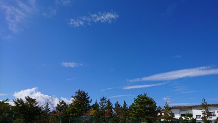 今日の山中湖はは朝からいい天気で、日中は26.7℃まで気温が上がりました。ニュースでは30℃越えなどの地点もあり、10月の最高気温を更新したところもあるようです。今朝の最低は17℃。温かくなったり寒くなったりで、体調管理には気を付けて風邪を引かないようにしたいですね。写真は12時、当館テニスコートから富士山です。雲に覆われて全く姿が見えませんでしたが、真っ青な青空がすごく気持ちよかったです。18/10/07