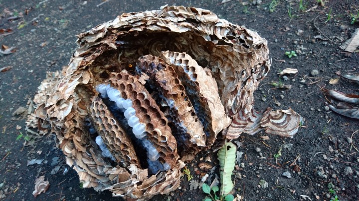 秋はスズメバチの活動が活発になるそうです。今年は10個くらいスズメバチの巣を駆除しました。ここ最近は余り見なかったのですが、ニュースで秋は活発になるとのことでした。そんな矢先、今日25cmくらいの巣を1つ駆除しました。刺されると危険ですので、注意したいです。今日の山中湖は曇り時々晴れ、午前中は雨が少しぱらついた時間がありました。最高気温は19℃、今朝の最低16℃18/10/08