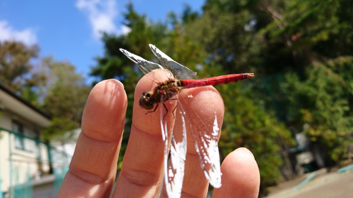 今日の山中湖は晴れ時々曇り、最高気温は21℃、今朝の最低は11℃。日中は日差しが温かくてとても過ごしやすい1日でした。写真はテニスコートで見つけた赤とんぼ。小さいトンボで手に止まってかわいかったです。秋ですね。