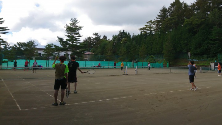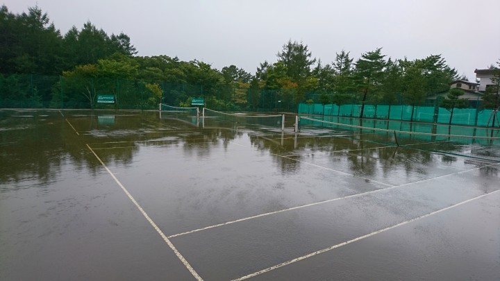今日の山中湖は天気が不安定で、朝6時、10時に雨が降り1日中強風でした。写真は午前11時の当館テニスコートです。雨でプールのようですが、午後からは普通にテニスが出来ました。きめ細かく水はけがよいのは、毎年トラクターでテニスコートを掘り起こしているためです。炎天下にも強く長期合宿にとても適しているコートだと思います。ぜひ利用して下さいね。宿泊中のローランギャロ様は、午後から強風でしたが、楽しそうにみんなでテニスをしていました。夜は肝試し、イベントも盛りだくさんの合宿です。最高気温は24℃最低17℃