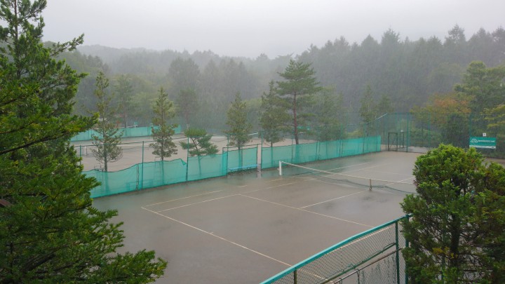 今日の山中湖は天気が不安定で、朝6時、10時に雨が降り1日中強風でした。写真は午前11時の当館テニスコートです。雨でプールのようですが、午後からは普通にテニスが出来ました。きめ細かく水はけがよいのは、毎年トラクターでテニスコートを掘り起こしているためです。炎天下にも強く長期合宿にとても適しているコートだと思います。ぜひ利用して下さいね。宿泊中のローランギャロ様は、午後から強風でしたが、楽しそうにみんなでテニスをしていました。夜は肝試し、イベントも盛りだくさんの合宿です。最高気温は24℃最低17℃18/09/07