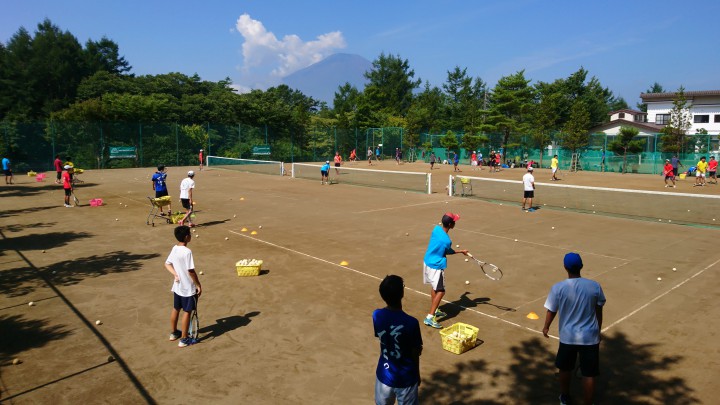 合宿4日目、富士山をバックにテニスを頑張っています。