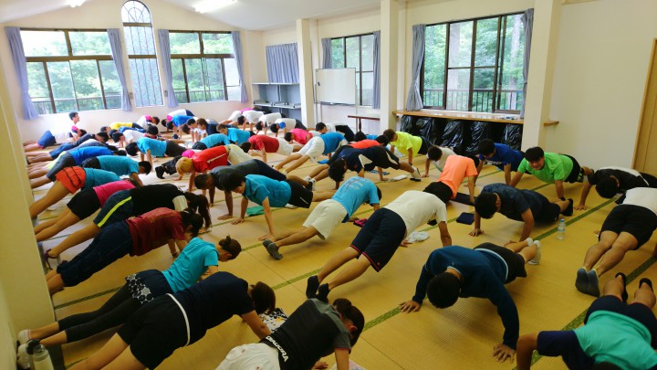 今日の山中湖は台風13号の影響で、朝から雨となりました。宿泊中の庭球部の皆さんは、残念ながらテニスが出来ず、多目的ホールで一斉に筋トレです。皆さんつらそうですが、夜BBQなので、頑張ってお腹を空かせて下さいね。最高気温は23℃、最低19℃。