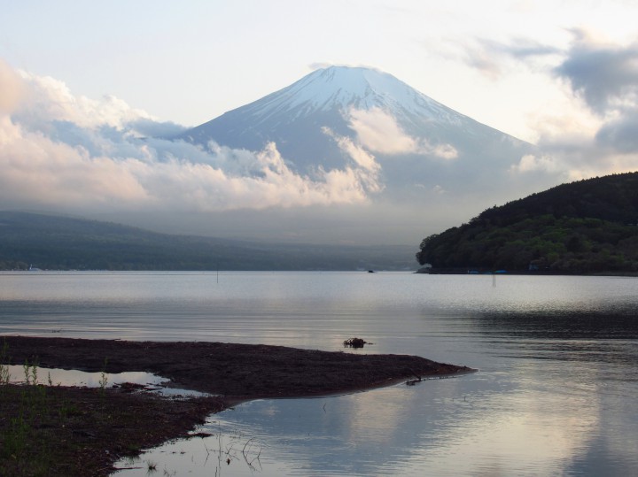 今日の山中湖は日差しがとても強く、最高気温は7月中旬並の24.8℃、本当に夏が来たかのような陽気でした。今朝の最低気温も6月中旬並の12℃。昨日はロビーでストーブを点けていたのが信じられません。日中は快晴で富士山がよく見えました。写真は午後6時20分、山中湖平野の浜からの富士山です。雲が少し出ていました。18/05/14