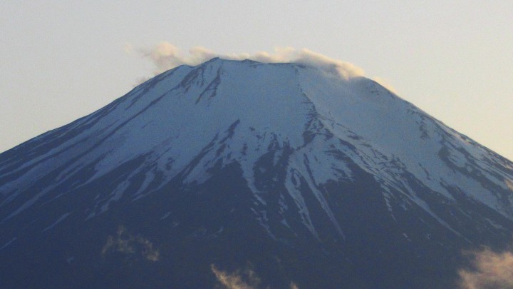 今日の山中湖は日差しがとても強く、最高気温は7月中旬並の24.8℃、本当に夏が来たかのような陽気でした。今朝の最低気温も6月中旬並の12℃。昨日はロビーでストーブを点けていたのが信じられません。日中は快晴で富士山がよく見えました。写真は午後6時20分、山中湖平野の浜からの富士山です。雲が少し出ていました。