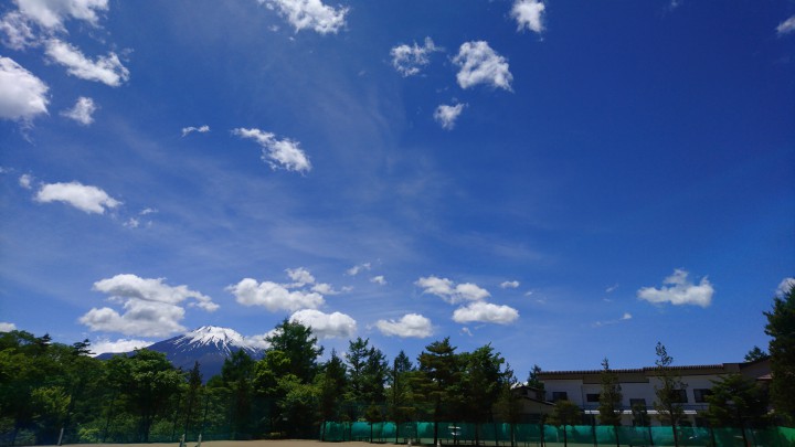 今日はよく晴れていた山中湖、最高気温は6月下旬並の22℃、今朝の最低は6℃、時たま吹く風が心地よい1日でした。写真は当館テニスコートから撮った青空です。富士山の上にはぽつぽつした雲が漂っていて面白かったです。快晴よりも雲があった方が面白いですね。18/05/21