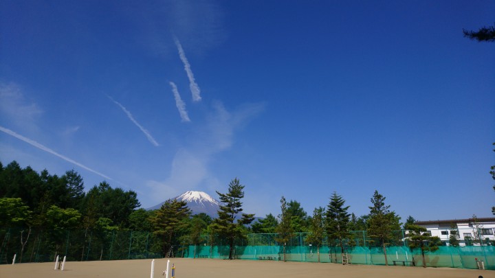 今日は一日中快晴の山中湖でした。写真は当館テニスコートからの富士山です。真っ青な空に飛行機雲4つが富士山に向かっていて、まるで大きな爪のようでした。面白い空模様でした。今日は日差しが強く最高気温は22℃、今朝の最低は5℃でした。明日は昼前から雨が降る予報です。ここ数日晴れ続きで乾ききったテニスコートには恵みの雨になりそうです。18/05/22
