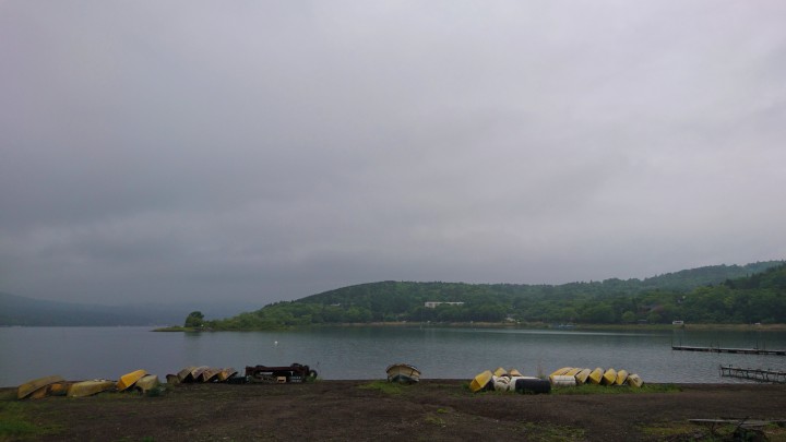 今日は朝から寒い日となった山中湖、最高気温は15℃で昨日よりも7℃低くなりました。今朝の最低気温は4℃、午前中は曇りで正午になると雨が降り出しました。降り方はぽつぽつですが夜は本降りになる予報です。写真は午後2時、山中湖平野の浜から富士山方面を撮りました。静かな湖に小雨が降っていて、雲で富士山は見えませんでした。18/05/23