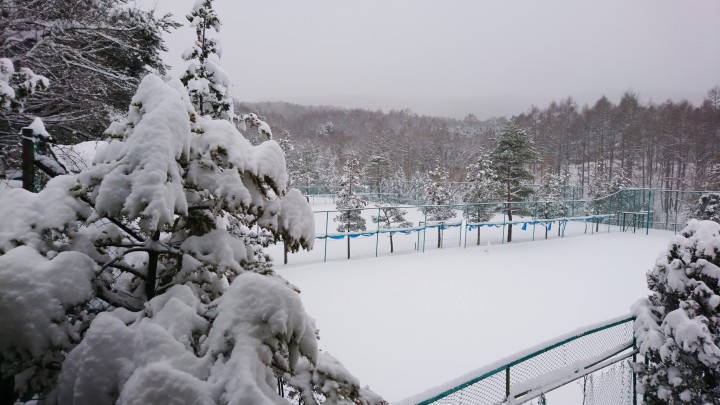 今日の山中湖は朝から雪となっています。予報では降雪量30?。この雪は関東一帯で降っているようです。今朝の最低気温は-2℃。午前11時で降雪量は庭で19cm。午後9時で27cm、大粒の雪がものすごく降っています。早く止んで欲しいです。最高気温は0℃。写真は午後1時、テニスコートはご覧の通り雪だらけ。昨日は全く雪がなかったのですが・・・