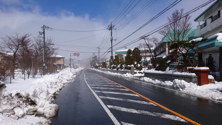 季節外れの大雪は未明にはみぞれ・雨に代わり、午前10時に雨は止みました。ニュースでは山中湖の降雪量は36cmでした。その後は晴れ間が出て最高気温は10℃。今朝の最低0℃。写真はお昼の国道413号線です。幹線道路の除雪はほぼ完了していますが、脇にはたくさんの雪がありますので、スタッドレスは必須です。18/03/22
