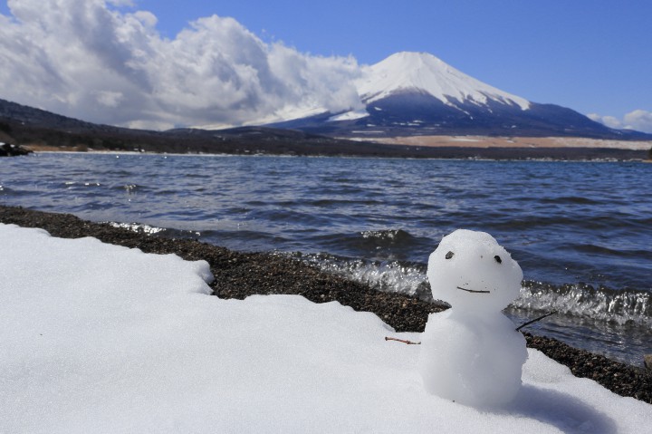 今日の山中湖は晴れ、夕方5時から雨が降り出しました。今朝の最低気温は2℃、日中はよく晴れて最高気温は4月上旬並の11℃、10時になったら雪が一気に解け出しました。山梨県では桜の開花が発表されましたが、残念ながら山中湖ではありません。しばらくは春めいた陽気が続くらしいので、雪解けが待ち遠しいです。写真は12時、山中湖へ行って雪だるまを作ってみました。10cmの小さいものですけど。動画もツイートしたので見て下さい。トップページ右下です。